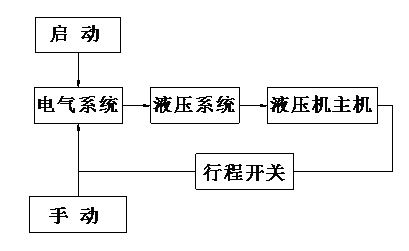 從上面的控制順序框圖可以看出,龍門式雙柱液壓機(jī)的工作原理由電氣控制系統(tǒng)控制液壓系統(tǒng),液壓控制系統(tǒng)再控制主機(jī)工作,主機(jī)動作觸及行程開關(guān),將信號反饋給電氣控制系統(tǒng),實現(xiàn)循環(huán)控制。